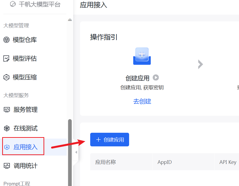 进入控制台之后,我们在侧边栏找到【大模型服务】下的【应用接入】,然后选择【创建应用】